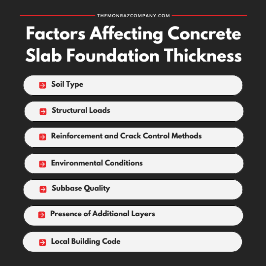 Another important factor when determining slab thickness is the projected weight of the complete structure. Residential properties typically use 4 to 6-inch slabs, while commercial buildings often require 6 to 12-inch foundations.