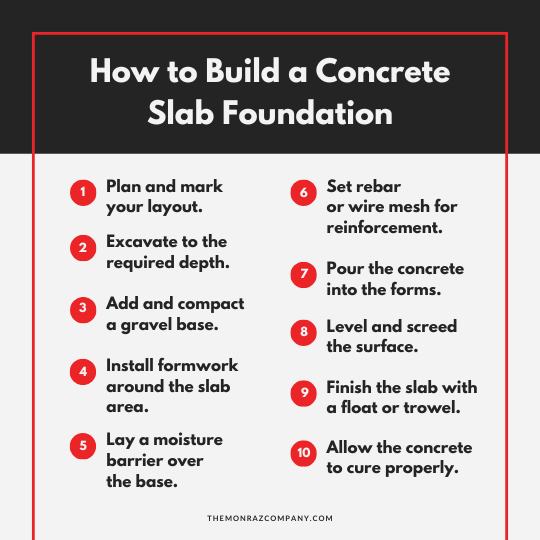 Set up wooden or metal forms along the edges of the slab. Ensure they are level, square, and securely braced, because the forms will hold the poured concrete in straight, accurate boundaries. Any shifting during the pour can change the slab thickness and compromise the final finish.
